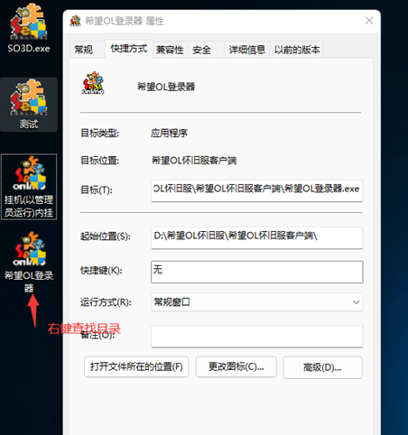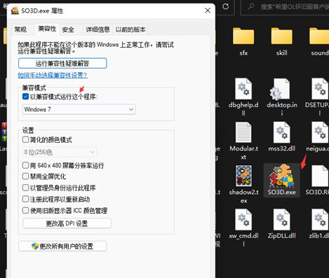 如果你的是WIN10 WIN11 游戏老卡住,或是闪退请到游戏目录找到so3d.exe 按右键属WIN7模式。如果你是WIN7系统可以无视这个。在桌面希望OL登陆器按右键属性,然后点查找目标他就会打开游戏目录然后你就可以看到SO3D.EXE.然后择着他按右键属性。择着WIN7模式。